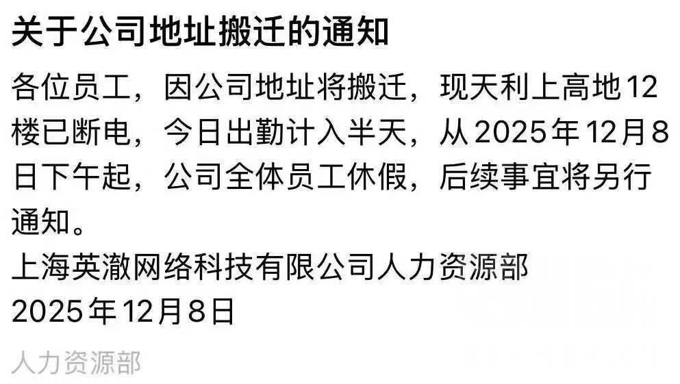 昨天,互联网上流出了一张英澈内部通知的图片,其内容称:公司的地址将搬迁,原办公室已停电,从昨日下午起,公司全体员工休假,后续事宜待进一步通知。