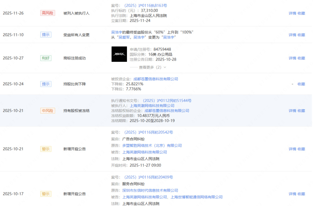 在刚刚过去的11月当中,英澈也被列入了被执行人名单。