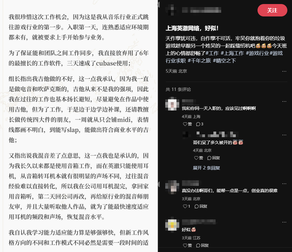 直到最近,英澈欠缴租房物业相关费用,即将搬迁的消息传出,英澈此时已经走到了悬崖边缘。在这一消息传出后,一位英澈的前作曲在小红书上发了多张图片发起声讨,阐述了自己入职前后三个多月遭无故辞退并且得不到赔偿的经过,并表示自己有录音证据,此事也是引发了不少玩家讨论。