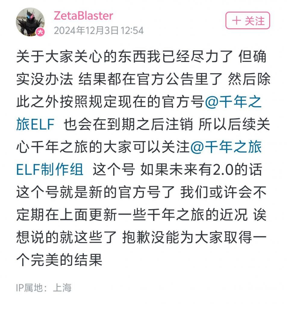 随着重新开服后,《千年之旅》更是发生了一件极其戏剧性的事件,在开服后的首次回应直播当中,彼时的《千年之旅》制作人团子直接在直播当中提出卸任,他表示:会招一个更专业、更懂ml,更懂玩家的制作人来接替自己的位置。
