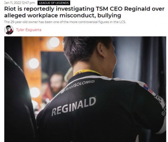 2022年华盛顿邮报报道过Reginald在TSM及旗下数据分析平台Blitz内营造“恐惧管理氛围”,遭职场虐待指控。