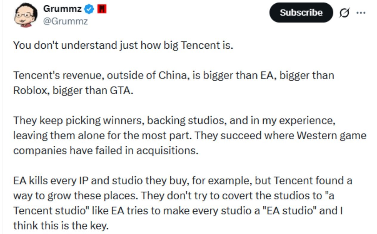 Kern强调,腾讯与西方游戏公司的收购策略截然不同。他批评艺电等公司“扼杀了其收购的每一个IP和工作室”,而腾讯则善于挑选有潜力的赢家,投资后给予工作室充足自主空间,不试图将它们全部变成“腾讯工作室”。腾讯的尊重创作自主性的策略被认为是其全球成功的关键。其国际市场游戏收入在2025年第三季度同比增长43%,达到208亿元,创下新高。