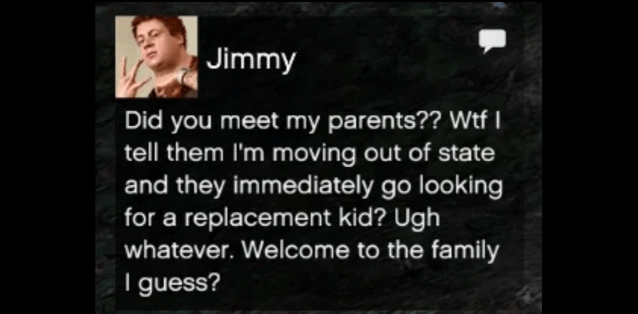 在《GTA Online》新DLC“山中安全屋”中,麦克回归剧情里透露,其儿子吉米终于要搬家了。游戏博主GameRoll评价吉米为“懒汉中的懒汉”,尽管已30多岁,却仍与父母同住啃老。