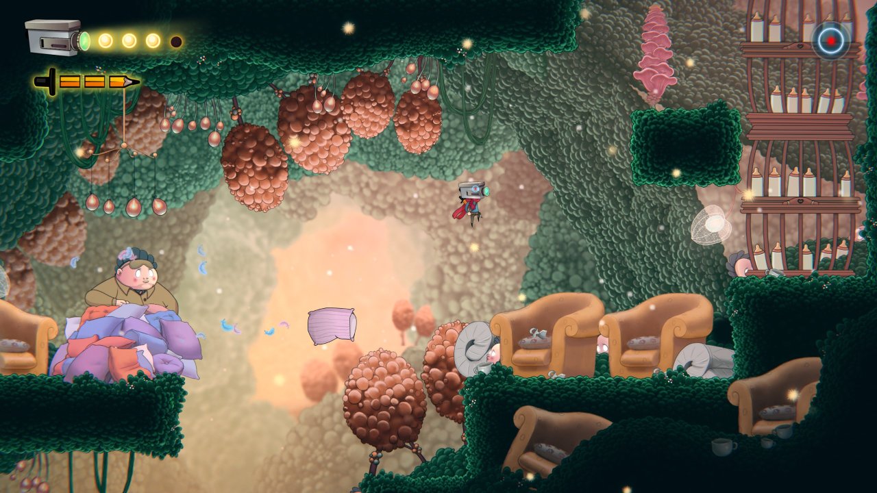 Demo开放了柔软森林和酒店两张地图,以探索驱动为主。搜集地图碎片,一步步点亮地图各个角落;寻找可扫描的物品,找到收集品。靠着跳跃技巧,基本上可以避开大部分的小怪战斗。