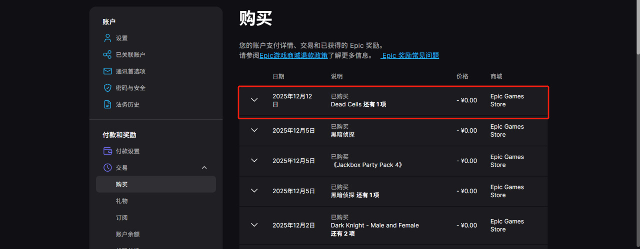4.若不放心是否领取成功可以进入E宝账户的“交易”页查看:Epic购买记录页