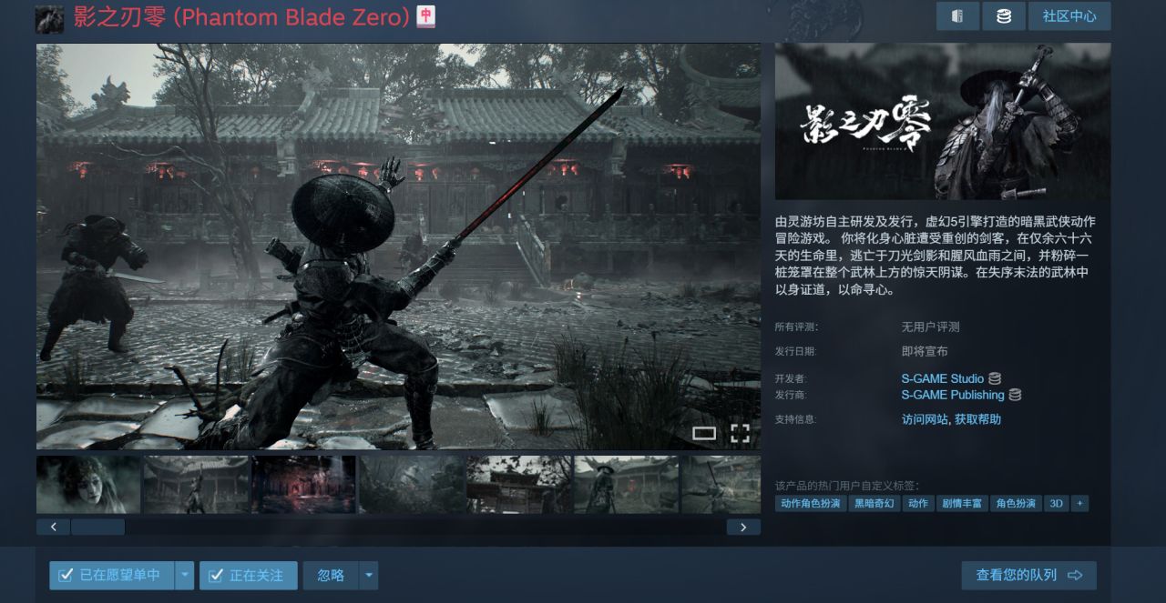 《影之刃零》Steam页面现已上线,官方宣布发售日期将于今日TGA上公布。