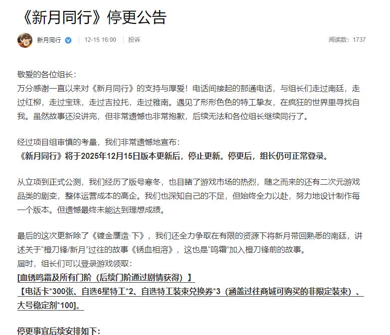《新月同行》于2024年10月24日正式公测,截至今日宣布停更消息,也不过运营了一年出头。