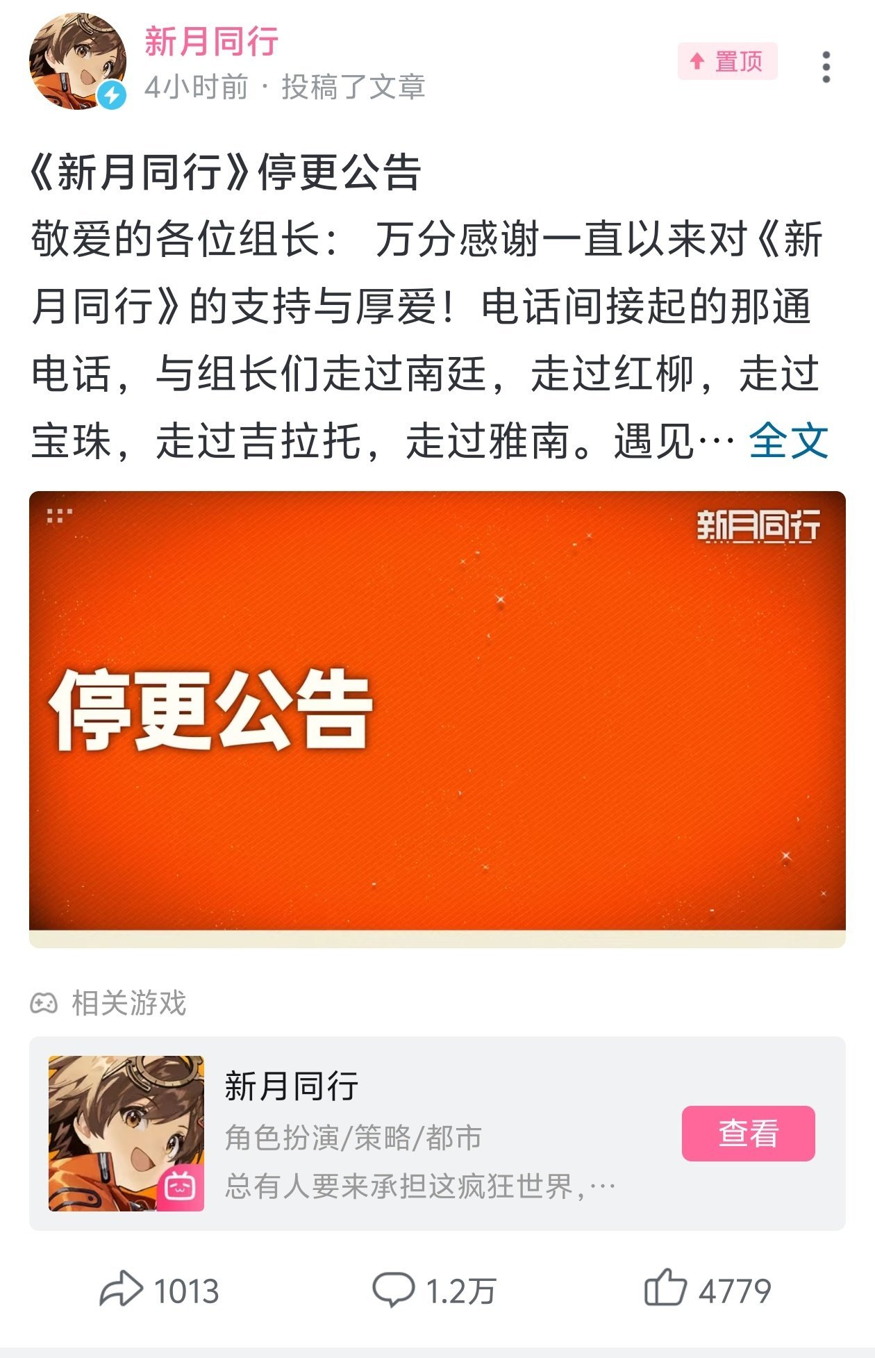 ▌《新月同行》停更公告