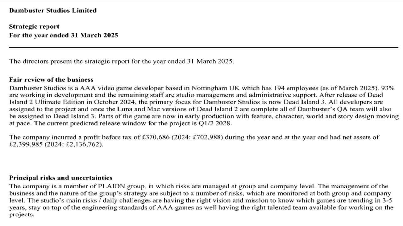 《死亡岛》系列开发商Dambuster Studios年度战略报告现已公开。