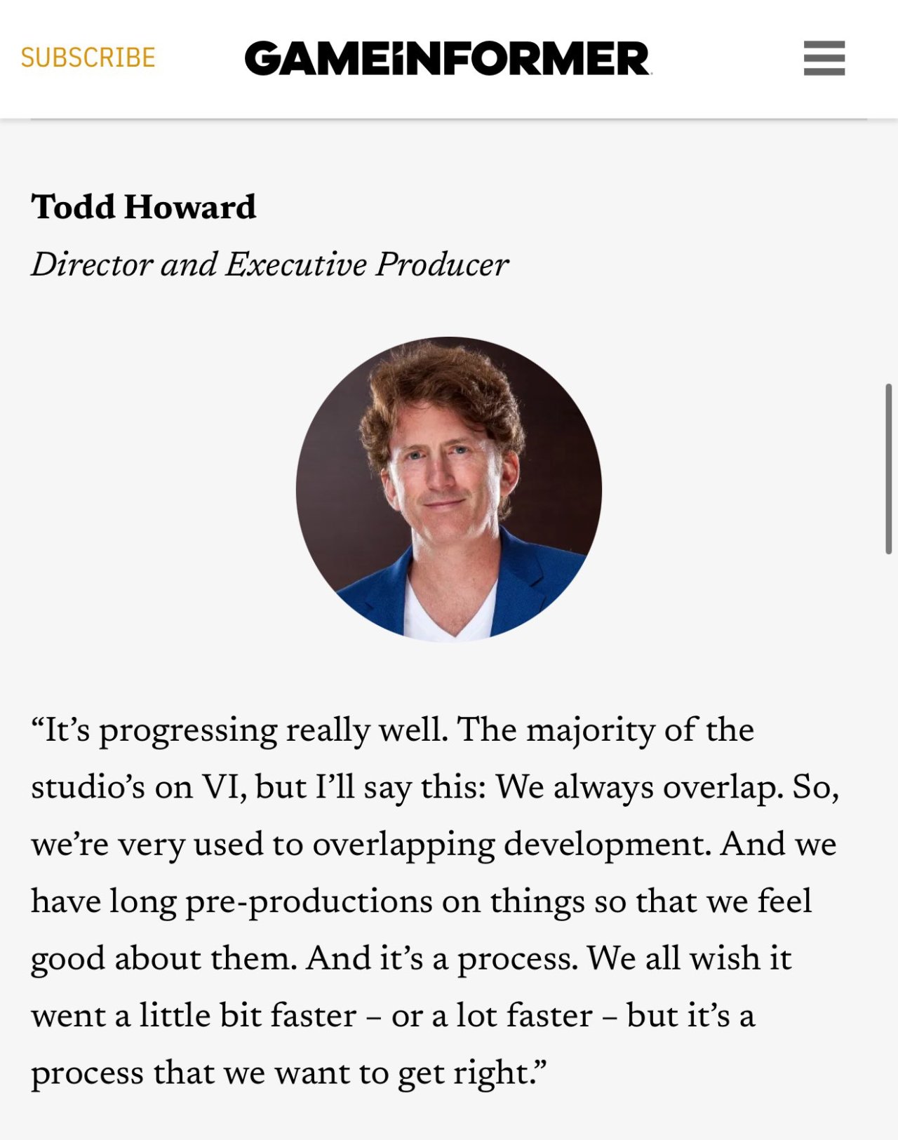 陶德近期接受采访时谈及《上古卷轴6》的开发进展:“游戏进展得非常顺利。目前工作室的大部分人员都在投入《上古卷轴6》的开发。