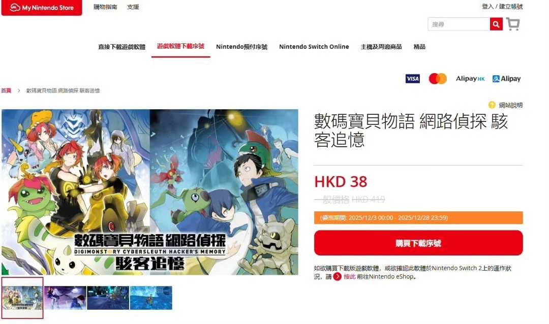 任天堂ns港服《数码宝贝物语:网络侦探+骇客追忆》两款数字版游戏合集只要38HKD港币,差不多34元人民币,对数码宝贝感兴趣ns玩家可以入手,性价比超高,比买2张ns实体版卡带划算多了。