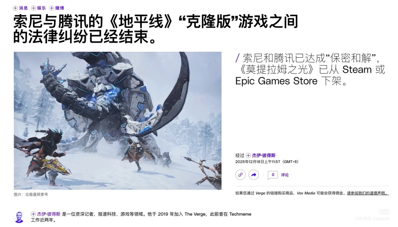 据外媒 The Verge 报道:今年7月,索尼起诉腾讯,试图阻止游戏《Light of Motiram》的发布,索尼声称该作是其热门系列《地平线》(Horizon)的“照搬式克隆”。但据周三提交的一份法院文件显示,这场法律战已经结束;两家公司已达成一项“保密和解”,案件也已被以“有偏见地驳回”的形式结束。
