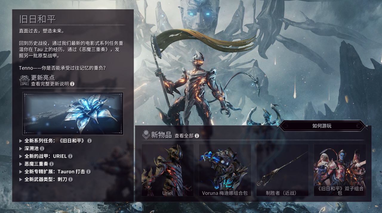 咳咳....咱们来说点正经的,wf这游戏说实话也算是刷子游戏里面活的最久的头牌选手了,其中一个重要原因就是一直在更新版本内容,不说每隔一段时间稳定推出的新甲或者是Prime,就说九重天,1999还有最近的旧日和平这些大版本超大量内容的更新,在十年中不断的扩充下来的玩法就能够让玩家沉迷其中,那么咋今天就来看看这新版本更新了啥。