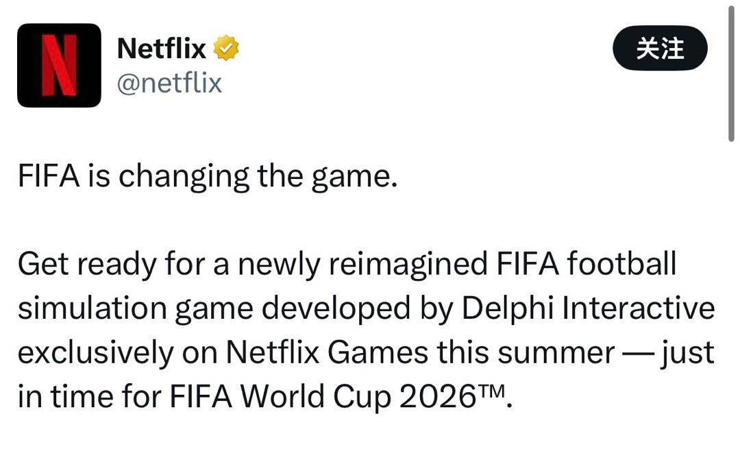 • FIFA 宣布与 Netflix Games 达成独家合作,定档 2026 年夏季