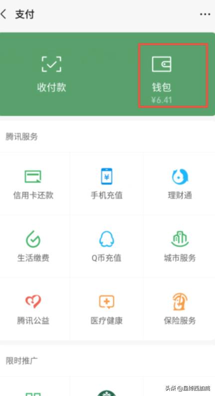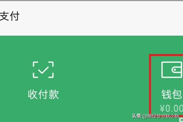 2、进入到支付的界面后,我们可以看到绿色方框内有两个选项【收付款】和【钱包】,我们点击进入【钱包】。(如果我们没有开启密码锁的话,手机被别人偷掉,直接进入到这个界面,使用条码付款就能直接把钱扫掉)